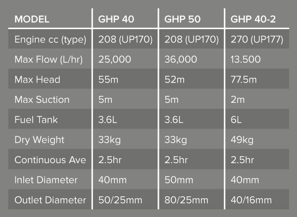Units are supplied complete with hose clamps & water strainers, inlet fittings, rubber mountings and a roll cage. All engines are OHV engines for better fuel efficiency, low vibrations and more power.