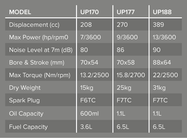 These UP series Red Rhino compact engines feature overhead valve designs for a cooler and cleaner running engine that delivers more power, longer engine life and improved fuel economy.